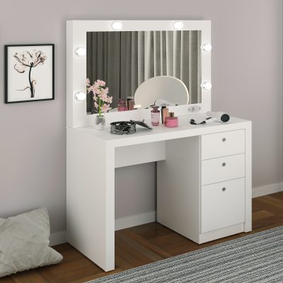Essa penteadeira além de elegante é diferenciada por ser no estilo CAMARIM, onde as 6 lâmpadas acopladas na moldura do espelho facilitam muito na hora de fazer a maquiagem com precisão.